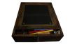 Se trata de una pieza neoclásica de línea sencilla, formada por tres cuerpos desiguales, el central más ancho. Va decorado a base de filetes, finas molduras y algunos apliques en metal dorado, que, a su vez, sirven para enmarcar los diferentes cuerpos. Completa su decoración con cuatro incrustaciones en pasta blanca y azul, a modo de camafeos. Tres en la parte superior y una, mayor, en el centro del cuerpo, con una figura alegórica, clásica, de muchacha con túnica y de pie, en actitud pensativa, y una máscara sobre la cabeza. |