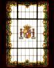 Vidriera con el escudo de España en la zona central (este escudo es posterior a al resto de la vidriera original de los años 50). Una orla vegetal con el cordón franciscano recorre todo el perímetro de la vidriera. |