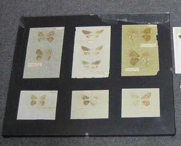 Cuadro con seis cuartillas de calcos de mariposa cubiertas con cristal. La técnica de los “Calcos de mariposa” fue inventada por el Padre Longinos Navás, y consistía en la aplicación de cera en una cuartilla de papel, sobre la que se colocaban las alas de mariposa previamente cercenadas. Los pigmentos de las alas, quedaban adheridos al papel obteniendo así, un “calco” del insecto. Este álbum fue realizado el último año de su vida entre mayo y junio de 1938.