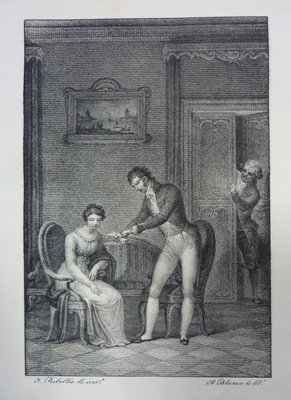 La escena trascurre en un interior, se trata de una casa de burgueses por la elegancia. A la izquierda aparece una mujer sentada sobre un sillón. En el centro, un hombre de pie abriendo una carta y parece reprochársela a la mujer. A la derecha de la escena, un caballero de una edad más avanzada asoma su cuerpo tras una puerta como si estuviera espiando lo que sucede. Todos los personajes visten a la moda del siglo XVIII, volviendo a la casaca, vestido francés.... El decorado de la casa con cortinas de ricos telares, puertas de gran tamaño, suelos con formas geométricas, etc.
